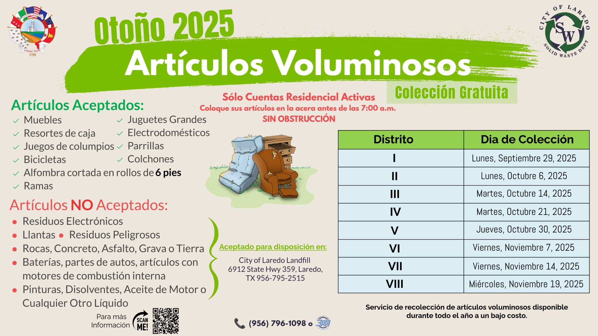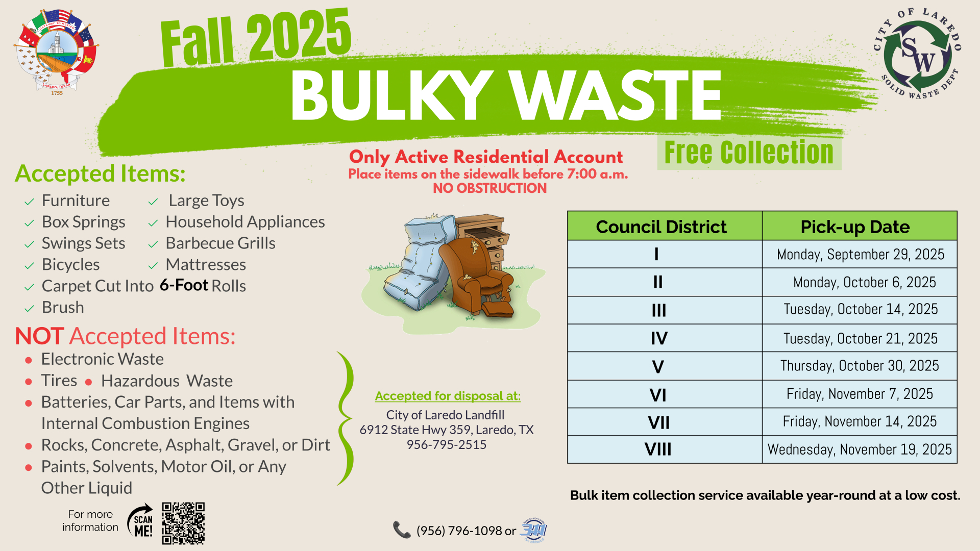 In accordance with City of Laredo Ordinance Chapter 14, Section 14-9 (m)(3)(6), residents are eligible for two free bulky item collections per year — one in the spring beginning in March and one in the fall beginning in October, scheduled by council districts.